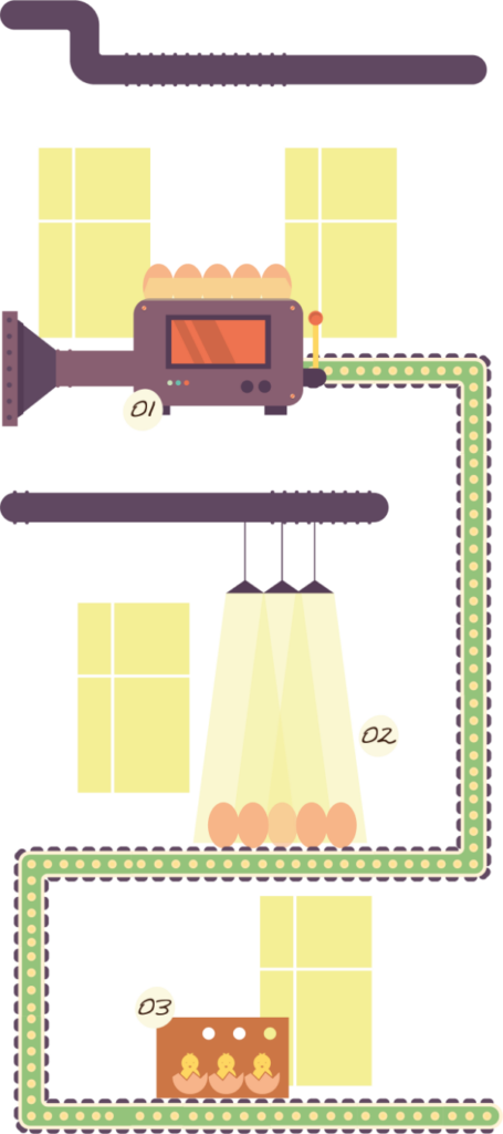La production de poussins pour l’élevage de volaille est assurée par Couvée d’Or, le couvoir de la filière Volay Péi. C’est là que sont élevés les animaux destinés à devenir des reproducteurs : ils fourniront ensuite les œufs d’où naîtront les poussins livrés aux éleveurs. Ces poussins deviendront à leur tour les futurs poulets, coqs, pintades ou dindes péi.